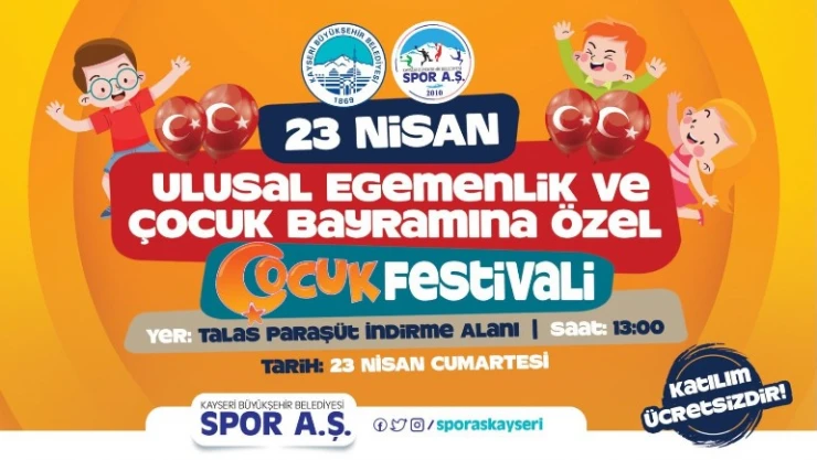 Büyükşehir Belediyesi Spor A.Ş.’nin düzenlediği Talas Paraşüt İndirme Alanı’ndaki ‘Çocuk Festivali’nde birbirinden farklı ve eğlenceli etkinlikler ile çocuklar eğlenceye doyacak. Çocuklar için adeta yok yok olan festivalde, şişme basketbol, şişme penaltı, şişme tırmanma alanı, şişme gladyatör, şişme langırt, şişme dart, şişme engelli parkuru, şişme denge oyunu, mini şişme kaydırak, balon futbolu, masa tenisi alanı, voleybol alanı, labirent oyunu, bilek güreşi, moss güreşi, okçuluk alanı, badminton alanı, ahşap oyun alanları, lazer run etkinliği, mini maraton etkinliği, paten yarışı, sahne önü oyunları (sandalye kapmaca, çuval yarışı, kapak oyunu, halat çekme), sahne gösterileri (çocuk dansları) ve bando takımı dinletisi ile 7-10 yaş mini maraton, 11-15 yaş mini maraton etkinlikleri gerçekleştirilecek.