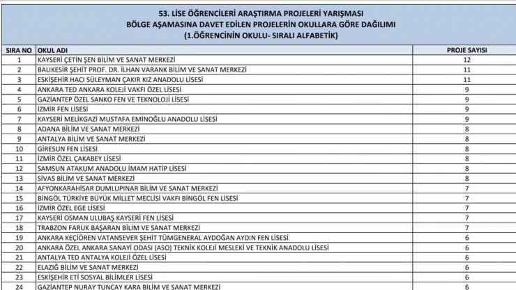 Bilim İnsanı Destek Programları Başkanlığı (BİDEB) tarafından bu yıl 53’üncüsü düzenlenen Lise Öğrencileri Araştırma Projeleri Yarışmasında ön değerlendirmeyi geçen ve bölge yarışmalarına katılmaya hak kazanan projeler belirlendi.
