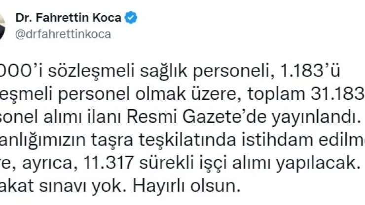 Sağlık Bakanı Fahrettin Koca, sosyal medya hesabından, 30 bini sözleşmeli sağlık personeli, bin 183’ü sözleşmeli personel olmak üzere toplam 31 bin 183 personel alımı ilanının Resmi Gazete’de yayımlandığını duyurdu.