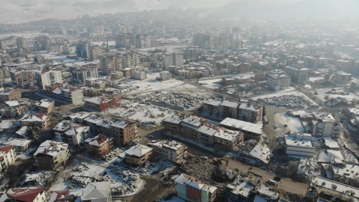 İlçe merkezinde bulunan ve çoğu 5 katlı olan binaların tamamına yakını çözerken, depremin yerle bir ettiği ilçe havadan görüntülendi.