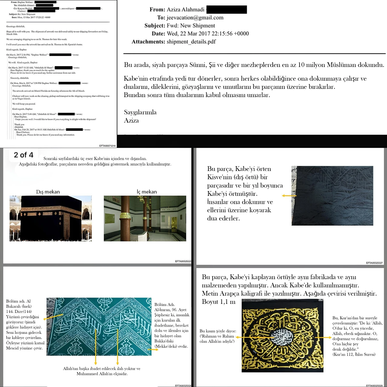 Sızan yazışmalara göre; Suudi kökenli, BAE’de yaşayan ve Boss Bunny Games CEO’su olan Aziza el-Ahmadi, Abdullah el-Maari ile birlikte Epstein’a Kâbe’nin örtüsü olan Kisve’den üç parça gönderdi. Gönderilen parçaların detayları: Kâbe’nin içinden alınan bir parça. Daha önce kullanılmış dış örtüden bir parça. Gümrük işlemlerinde "sanat eseri" olarak sınıflandırılabilmesi için gönderilen, hiç kullanılmamış üçüncü bir parça. Sevkiyat, Epstein’ın cinsel suçlu olarak kayda geçmesinden yıllar sonra, Mart 2017’de Florida’daki malikanesine British Airways aracılığıyla ulaştırıldı. "Dualar ve Gözyaşları Bu Örtüdedir" Aziza el-Ahmadi, Epstein’a gönderdiği e-postada, Müslümanlar için kutsal olan bu örtünün dini önemini şu sözlerle anlatıyor: "Siyah parça, en az 10 milyon Müslüman tarafından dokunulmuştur. Kâbe’nin etrafında tavaf ederken herkes bu örtüye dokunmaya çalışır; dualarını, dileklerini, gözyaşlarını ve umutlarını bu parçaya bırakırlar." Kasırga Sonrası "Yeni Bir Çadır" Sözü Eylül 2017’de Karayipler’i vuran Irma Kasırgası, Epstein’ın özel adasında ağır hasara yol açtı. Yazışmalar, Ahmadi’nin günlerce Epstein’ın sekreteriyle temasa geçerek adanın durumunu sorduğunu gösteriyor. Sekreterin hasarı anlatması üzerine Ahmadi’nin verdiği yanıt ise dikkat çekici: “Yeni bir çadır göndermeye söz veriyorum ;)” DNA Testi ve Gizemli Bağlantılar Dosyalarda yer alan diğer çarpıcı detaylar ise şunlar: Suudi Bağlantısı: Ahmadi’nin danışmanlığını yaptığı Raafat Al-Sabbagh, Suudi Kraliyet Sarayı’nda danışman olarak görev yapıyor. Gizemli Kit: Epstein’ın uzun süreli asistanı Lesley Groff’un, Ahmadi’ye bir DNA test kiti gönderdiği görülüyor ancak bu kitin amacı henüz bilinmiyor. Veda Ziyareti: Ahmadi, Epstein ile doğrudan az temas kurmuş olsa da bir e-postasında, New York’tan ayrılmadan önce doğum gününü kutlamak için Epstein’ın evine 15 dakikalık bir veda ziyareti yapmak istediğini yazıyor. El Ahmedi'nin, Epstein'a yazdığı e-postada örtünün manevi değerini 'Bu parçaya 10 milyon Müslüman dokundu' sözleriyle anlattığı da detaylar arasında. Sevkiyat, bir İngiliz havayolları şirketiyle Epstein'ın hapis cezasını çekmesinden ve cinsel suçlu olarak hüküm giymesinden çok sonra gerçekleşti.