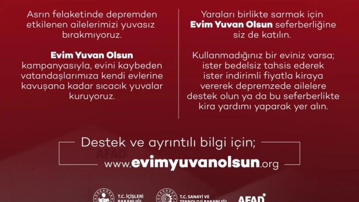 Afetzedelerin sıcak bir yuvaya kavuşmaları için “Evim Yuvan Olsun” sloganıyla bir kampanya düzenlendi. İçişleri Bakanlığı ile Sanayi ve Teknoloji Bakanlığının koordinasyonundaki kampanyaya AFAD, Türkiye Sigorta, EmlakJet, Hepsiemlak ve sahibinden.com destek verdi.