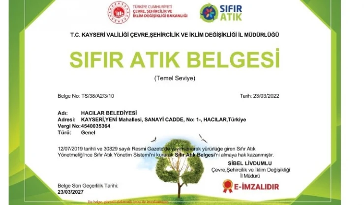 Cumhurbaşkanı Recep Tayyip Erdoğan'ın eşi Emine Erdoğan'ın himayesinde Çevre ve Şehircilik Bakanlığı'nca başlatılan Sıfır Atık Projesi çerçevesinde örnek belediyecilik sergileyen Hacılar Belediyesi sıfır atık belgesi aldı.