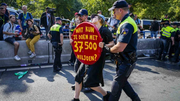Hollanda'da iklim aktivistleri fosil yakıt endüstrisine yönelik hükümet sübvansiyonlarının sona erdirilmesi talebiyle otoyolu kapatarak protesto düzenlerken polis, aktivistlere tazyikli su ile müdahale etti.