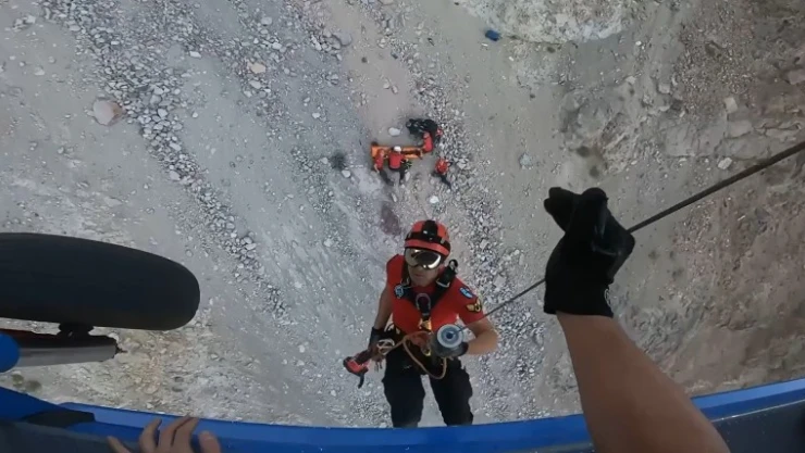 Erciyes Dağı'nda üzerlerine kaya yuvarlanması sonucu 1 dağcının öldüğü, 1 dağcının da yaralandığı olayda, kurtarma operasyonunun görüntüleri nefes kesti.