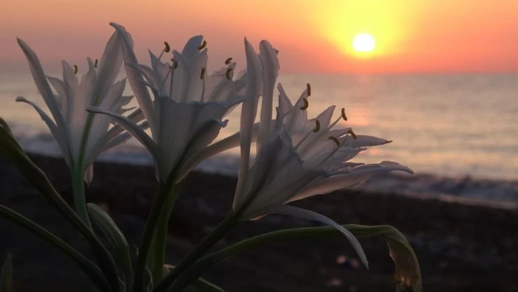 Akdeniz sahillerini süsleyen nesli tükenme tehlikesi altında olduğu için koruma altında olan ve koparmanın 109 bin 593 TL cezası olan kum zambakları, yoğun çiçekli dönemine girmesiyle görsel şölen sunmaya başladı.