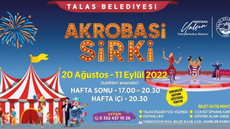 20 Ağustos-11 Eylül 2022 tarihleri arasında gösterilere sahne olacak akrobasi sirkinin biletleri, Talas Belediyesi veznesi, Osmanlı Evi, 7/24 Kütüphane kantini ve sirk gösteri alanında satışa sunuluyor.