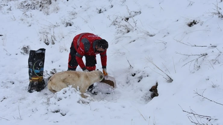 Soğuk havada karlı yollar sokak hayvanları için aşıldı