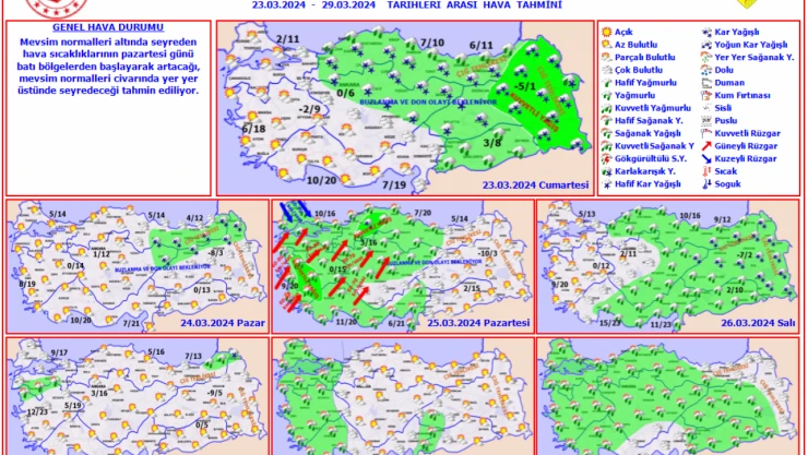 Yurt genelinin parçalı ve çok bulutlu, İç Anadolu'nun kuzeydoğusu, Karadeniz, Doğu ve Güneydoğu Anadolu ile Sakarya ve Ankara çevrelerinin yağışlı geçeceği tahmin ediliyor. Yağışların, Karadeniz kıyıları ile Güneydoğu Anadolu'da yağmur ve sağanak, yağış alan diğer yerlerde karla karışık yağmur ve kar şeklinde olması bekleniyor. Yağışların, Doğu Anadolu'nun doğusu, Siirt çevreleri ile Artvin'in iç kesimlerinde kuvvetli ve yoğun kar şeklinde olacağı tahmin ediliyor. Sabah ve gece saatlerinde iç ve doğu kesimlerde buzlanma ve don olayı bekleniyor. Doğu Karadeniz'in iç kesimleri ile Doğu Anadolu'nun kuzey ve doğusunda çığ tehlikesi bulunuyor.